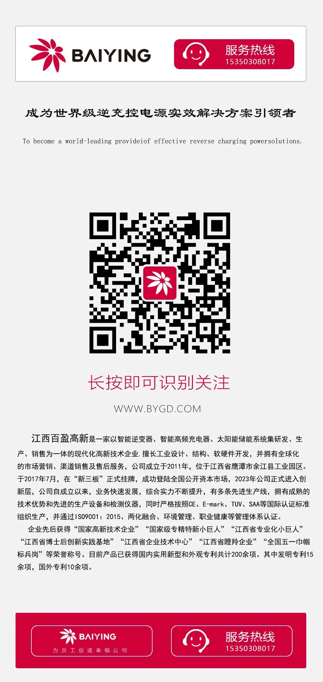 江西百盈是一家专注于智能逆变器、高频充电器、太阳能控制器等研发生产销售一体的高新技术企业,致力于为客户提供核心产品及服务。公司自2011年年成立以来,始终坚持以技术创新为驱动,汇聚行业顶尖人才,打造核心竞争力,现已成为年产值突破2亿元的行业领先企业。